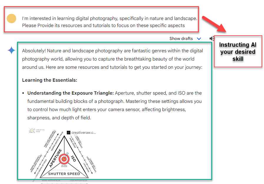 I began by telling the AI, “I’m interested in learning digital photography, specifically in nature and landscape.” The AI then tailored its resources and tutorials to focus on these specific aspects, enhancing the relevance of the learning material provided.