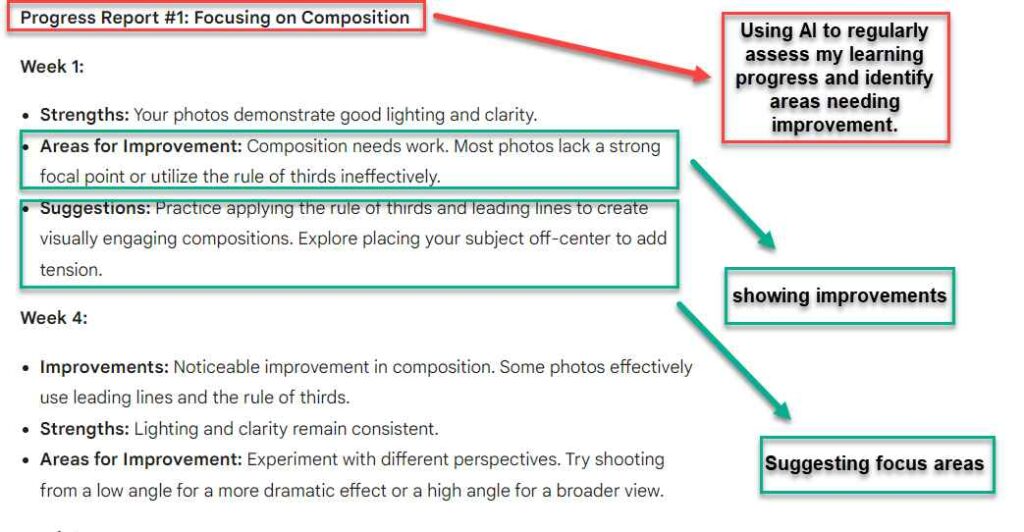 I reviewed progress reports generated by the AI, which analyzed my uploaded photographs over time, showing improvements and suggesting focus areas to enhance my photographic style and technique.